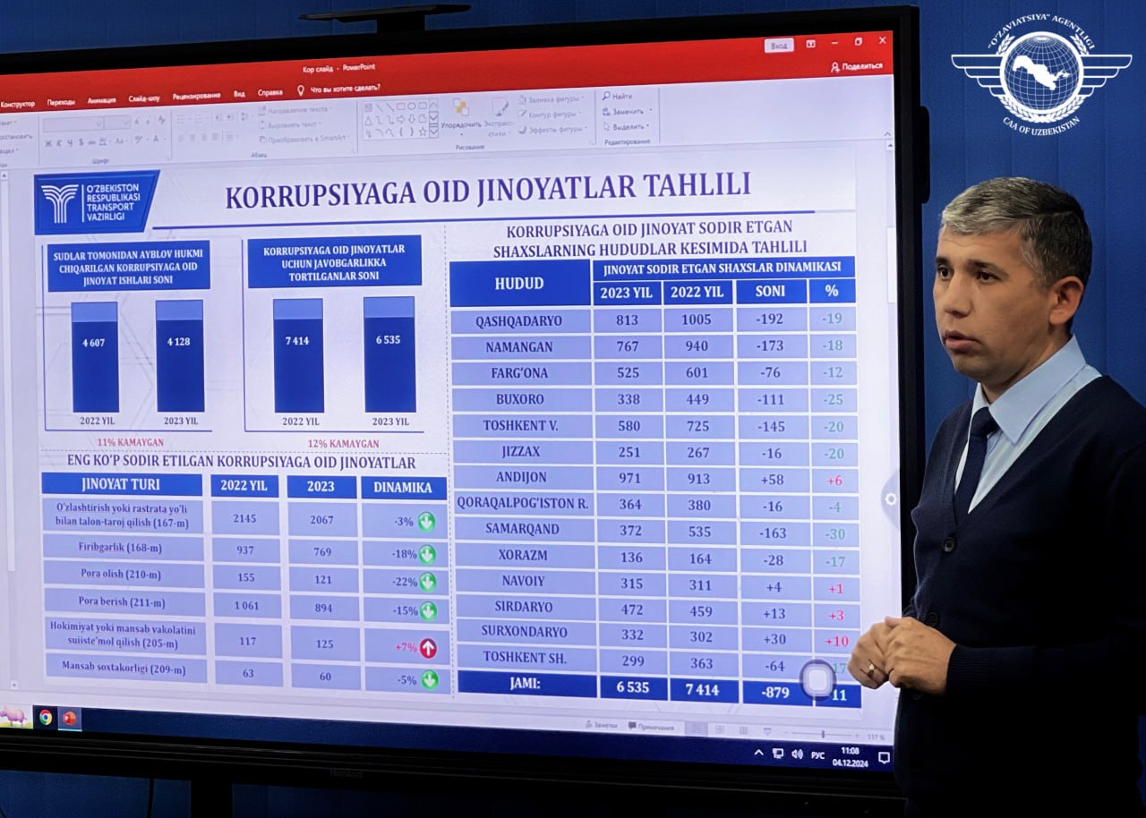по противодействию коррупции агентства «Узавиация» О. Пулатов при помощи презентационных материалов подробно разъяснили содержание Законов «О Противодействии коррупции» и «О конфликте интересов» Республики Узбекистан. Они также напомнили, что за невыполнение требований законодательства установлены меры административного
